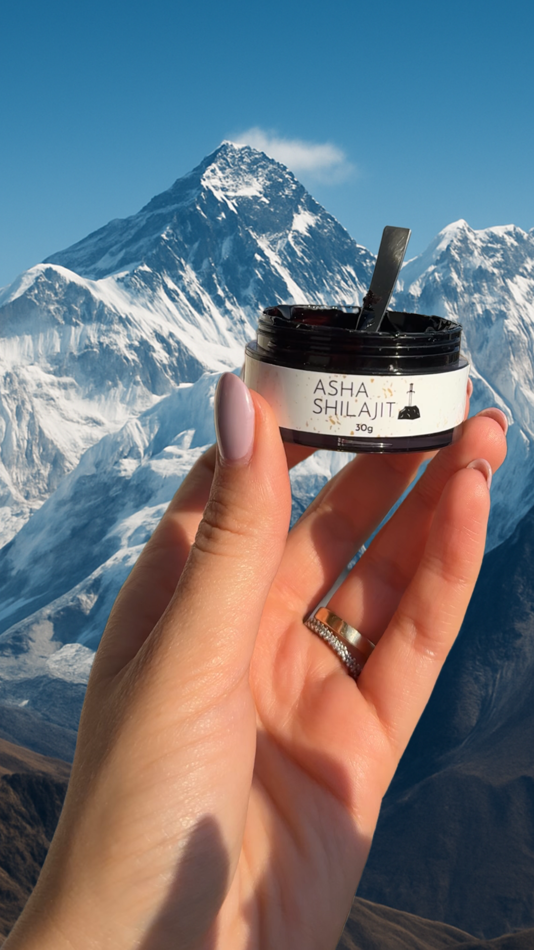 Collected by hand from the Himalayan mountain ranges, where shilajit oozes from mineral-rich rock crevices at elevations above 16,000 feet—formed over centuries by the earth’s pressure, heat, and decomposition, surrounded by untouched landscapes and sacred terrain revered for vitality.